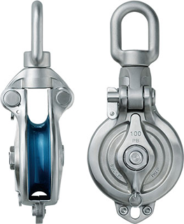 We broke the common practice of conventional blocks and adopted an asymmetric shape for the main body so that the fitting can pass through it without getting caught. Thanks to this shape, the sheave is covered by the main unit so that the rope does not get caught between the main unit and the sheave.