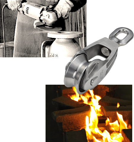 While Asano uses its advantageous casting technique for flexible molding, it adopts forged parts for products requiring high strength. For example, a swivel is a critical part used in block products and hung in high places for use. In order to add additional strength to this part, Asano adopts forged swivels.