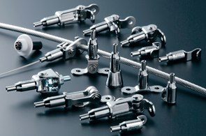 ワイヤーディスプレイは、ワイヤーを使用してパネルやボードなどを吊り下げたり、棚などを固定する金具です。絵画などの額縁や広告看板の吊り下げや、ショーウィンドウの展示など様々なシーンを演出します。