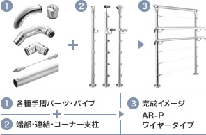 支柱高さ1,100mmの丸パイプ手摺「AR-P」をはじめ、支柱高さ850mmの歩行者用補助手摺「AR-850」・「AR-V400」、そして角パイプ手摺の「AR-K」、フラットバー手摺の「AR-F」。幅広い支柱タイプから、さらにワイヤー手摺、ガラス手摺などが選択可能です。これらのタイプから指定していただくだけで、設計デザインに合わせた手摺セットがご発注いただけます。