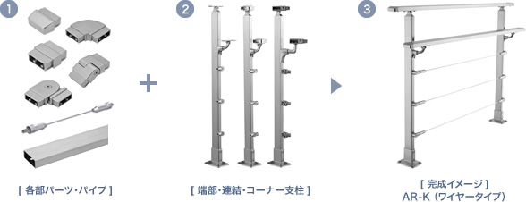 - 各支柱、手摺などのパーツで納品しますので、現場で組立施工をしてください。