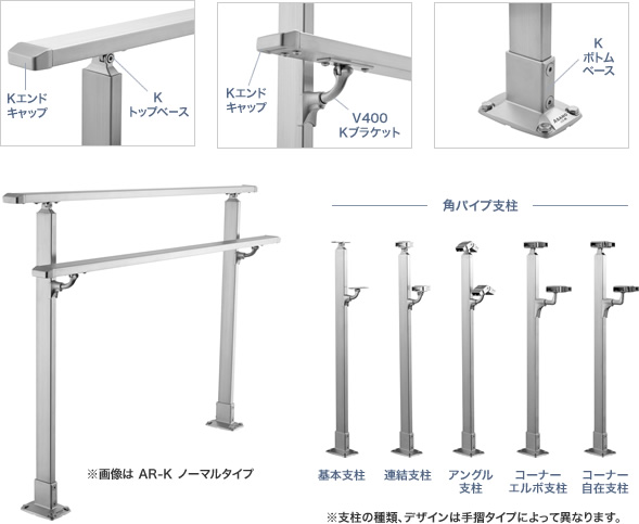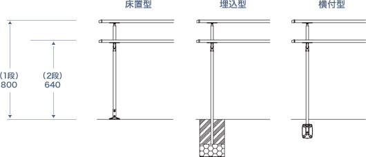 - 手摺はトップ手摺・2段シングル・2段ダブルから、支柱は床置型・埋込型・横付型から選択してください。
