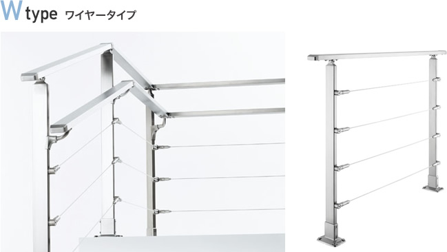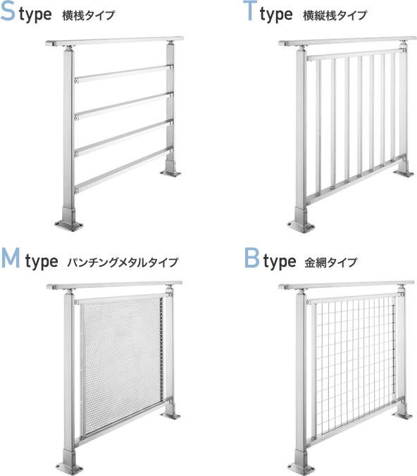 ワイヤータイプ、ガラスタイプ、横桟・横縦桟タイプ、パンチングメタルタイプ、金網タイプなど豊富なラインナップ。 様々な手摺デザインの要望に幅広くお応えします。