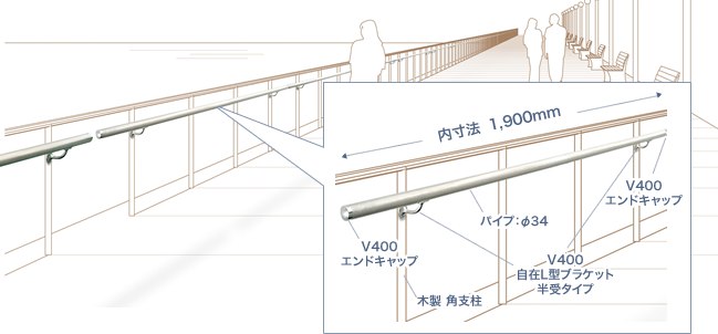 - 水平部手摺 木製角支柱 内寸法1,900mm の場合