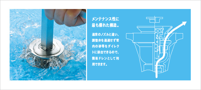 従来ノズルの内部構造を見直し、メンテナンス性に最も優れた独自の構造を創り出しました。配管末端部で砂詰まりが起きても、キャップを緩めるだけで管内、散水孔、ノズル内部全ての清掃が可能となる画期的なノズルです。