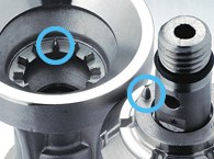ポンプは起動したまま、十字ハンドルでキャップを4~5回転緩めると散水孔、ノズル内部、管内の清掃が同時に可能なメンテナンス性に最も優れたノズルです。