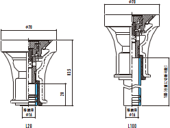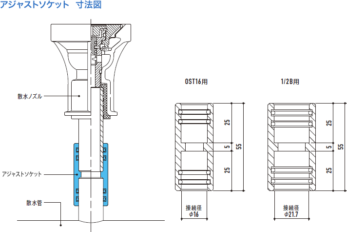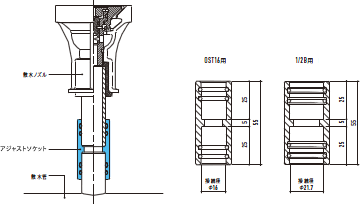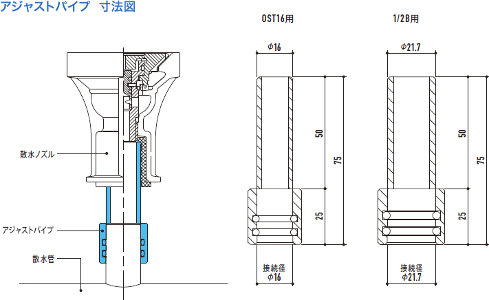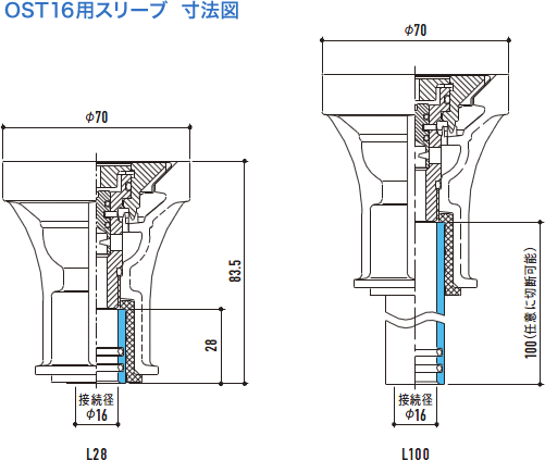 標準ノズルを接続管OST16仕様へ変換します。L=100は現場合わせで切断が可能。