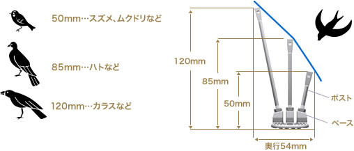 ワイヤーロープを張設するポストの高さは3種類あります。それぞれ、各鳥類がいやがるとされている高さです。