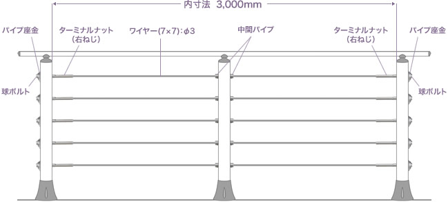 - AT-P[水平部]:ワイヤー(7×7)SUS304 直径=φ3mm 5段 の場合