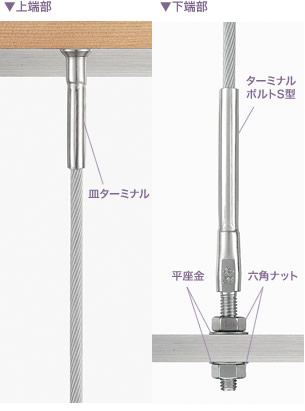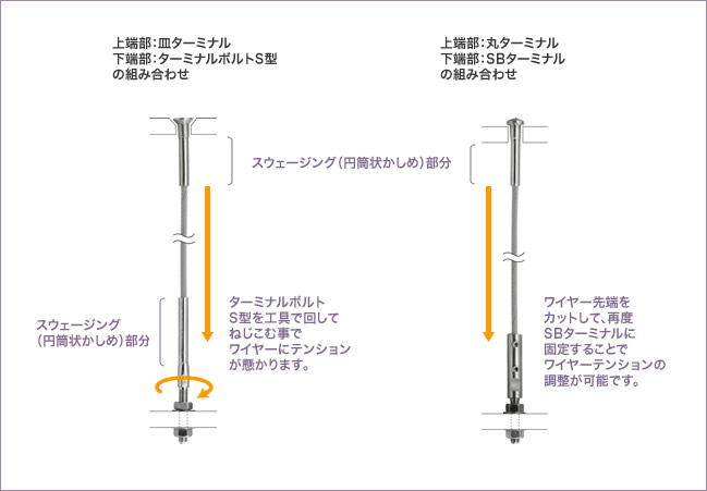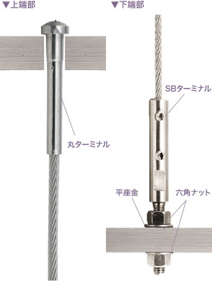 また、下端部にはターミナルボルト、ターミナルボルトS型、SBターミナルを使用します。特にSBターミナルは施工現場でワイヤーをカットして金具に収める仕様となるため、寸法の現場合せが必要な場合に有効です。