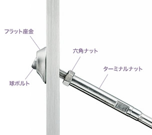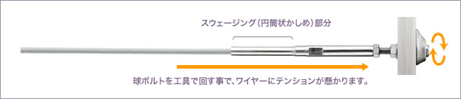 例えば経年してワイヤーに多少の緩みが出てしまった場合には、球ボルトを工具で回してねじ込むことで、ワイヤーテンションの微調整が可能です。